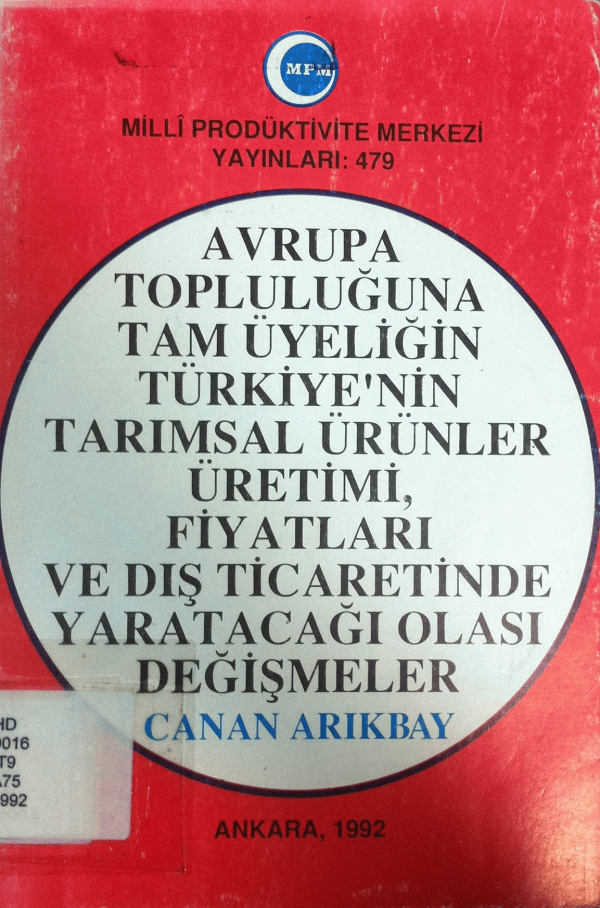 Avrupa topluluğuna tam üyeliğin Türkiye'nin tarımsal ürünler üretimi, fiyatları ve dış ticaretinde yaratacağı olası değişmeler / Canan Arıkbay