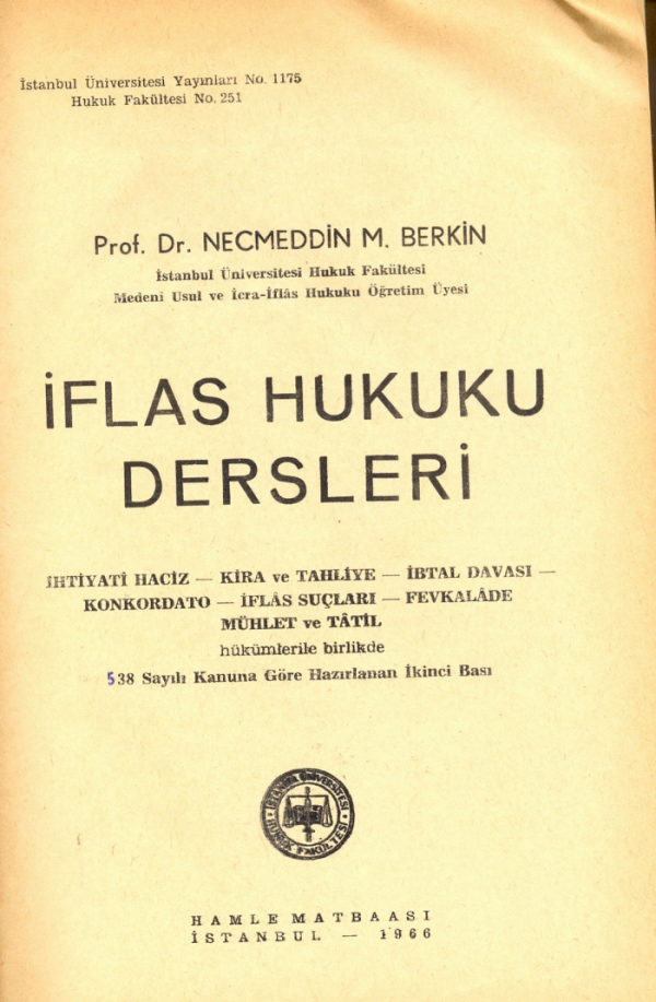 İflas hukuku Dersleri : ihtiyati haciz-kira ve tahliye-ibtal davası-konkordato-iflas suçları-fevkalade mühlet ve tatil / Necmeddin M. Berkin.
