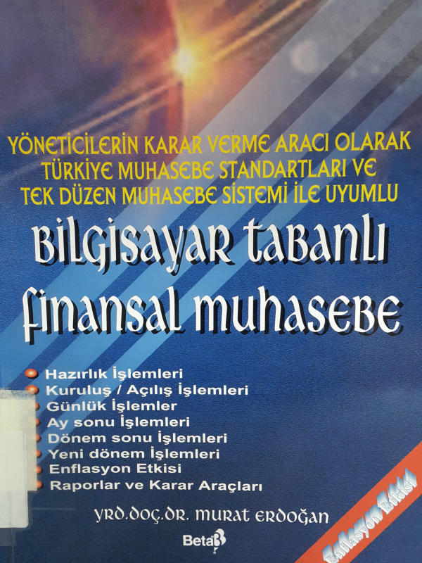 Bilgisayar tabanlı finansal muhasebe: hazırlık işlemleri,kuruluş/açılış işlemleri,günlük işlemler,aysonu işlemleri,dönem sonu işlemleri,enflasyon etkisi,raporlar ve karar araçları / Murat Erdoğan