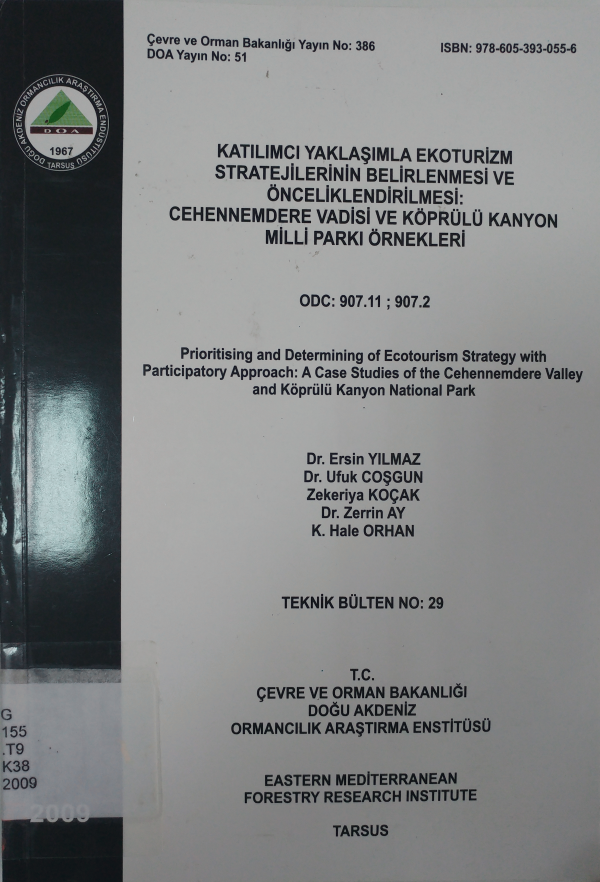 Katılımcı yaklaşımla ekoturizm stratejilerinin belirlenmesi ve önceliklendirilmesi: Cehennemdere Vadisi ve Köprülü Kanyon milli parkı örnekleri = Prioritising and determining of ecotourism strategy with particpatory approach: A case studies of the Cehennemdere Valley and Köprülü Kanyon national park / Ersin Yılmaz [and others].