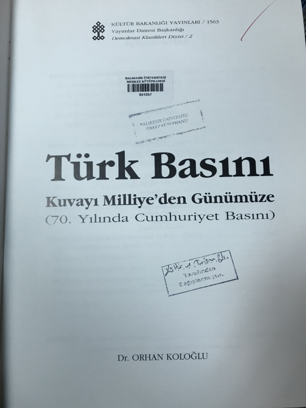 Türk basını : kuvayı milliye'den günümüze : 70. yılında Cumhuriyet basını / Orhan Koloğlu.