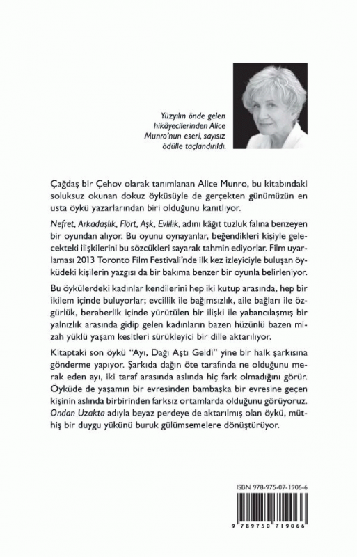 Çağdaş bir Çehov olarak tanımlanan Alice Munro, bu kitabındaki soluksuz okunan dokuz öyküsüyle de gerçekten günümüzün en usta öykü yazarlarından biri olduğunu kanıtlıyor. Nefret, Arkadaşlık, Flört, Aşk, Evlilik, adını kâğıt tuzluk falına benzeyen bir oyundan alıyor. Bu oyunu oynayanlar, beğendikleri kişiyle gelecekteki ilişkilerini bu sözcükleri sayarak tahmin ediyorlar. Film uyarlaması 2013 Toronto Film Festivali’nde ilk kez izleyiciyle buluşan öyküdeki kişilerin yazgısı da bir bakıma benzer bir oyunla belirleniyor. Bu öykülerdeki kadınlar kendilerini hep iki kutup arasında, hep bir ikilem içinde buluyorlar; evcillik ile bağımsızlık, aile bağları ile özgürlük, beraberlik içinde yürütülen bir ilişki ile yabancılaşmış bir yalnızlık arasında gidip gelen kadınların bazen hüzünlü bazen mizah yüklü yaşam kesitleri sürükleyici bir dille aktarılıyor. Kitaptaki son öykü “Ayı, Dağı Aştı Geldi” yine bir halk şarkısına gönderme yapıyor. Şarkıda dağın öte tarafında ne olduğunu merak eden ayı, iki taraf arasında aslında hiç fark olmadığını görür. Öyküde de yaşamın bir evresinden bambaşka bir evresine geçen kişinin aslında birbirinden farksız ortamlarda olduğunu görüyoruz. Ondan Uzakta adıyla beyaz perdeye de aktarılmış olan öykü, müthiş bir duygu yükünü buruk gülümsemelere dönüştürüyor. (Arka kapaktan)