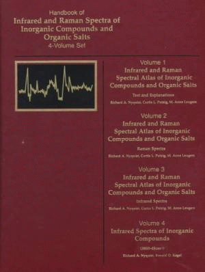 v. 1. Infrared and Raman spectral atlas of inorganic compounds and organic salts. Text and explanations -- v. 2. Infrared and Raman spectral atlas of inorganic compounds and organic salts. Raman spectra -- v. 3. Infrared and Raman spectral atlas of inorganic compounds and organic salts. Infrared spectra -- v. 4. Infrared spectra of inorganic compounds (3800-45 cm⁻¹) / Richard A. Nyquist and Ronald O. Kagel.