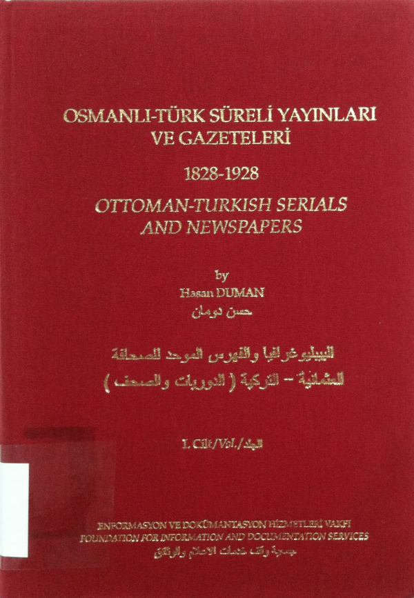 Başlangıcından harf devrimine kadar Osmanlı-Türk süreli yayınlar ve gazeteler bibliyografyası ve toplu kataloğu, 1828-1928 / Hasan Duman = A bibliography and union catalogue of Ottoman-Turkish serials and newspapers from beginning to the introduction of the modern Turkish alphabet, 1828-1928 / by Hasan Duman = al-Bībliyūghrāfiyā wa-al-fihris al-muwaḥḥad lil-ṣiḥāfah al-ʻUthmānīyah-al-Turkīyah (al-dawrīyāt wa-al-ṣuḥuf) min al-bidāyah ilá thawrat taghyīr al-aḥraf, 1828-1928 / Ḥasan Duman.