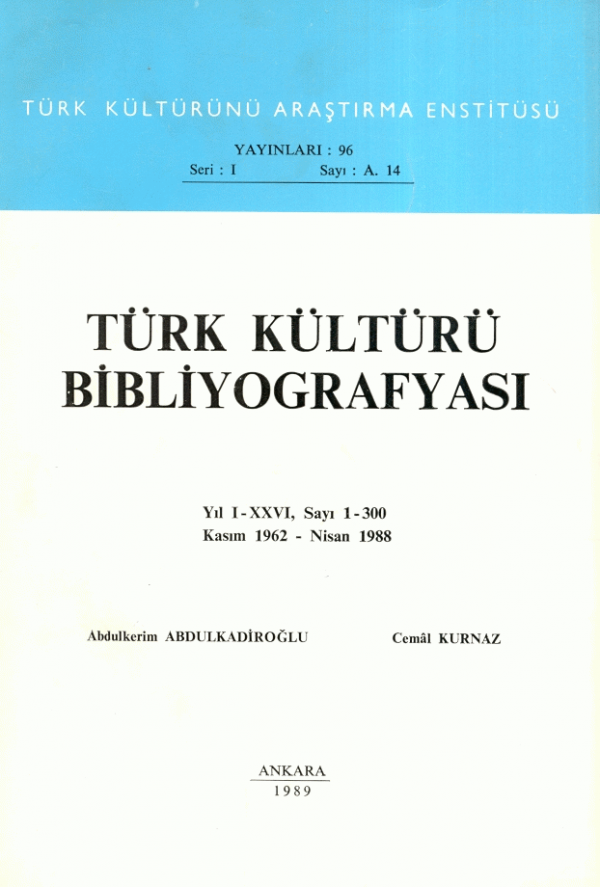 Türk kültürü bibliyografyası : yıl I-XXVI, sayı 1-300, Kasım 1962-Nisan 1988 / Abdulkerim Abdulkadiroğlu, Cemâl Kurnaz.